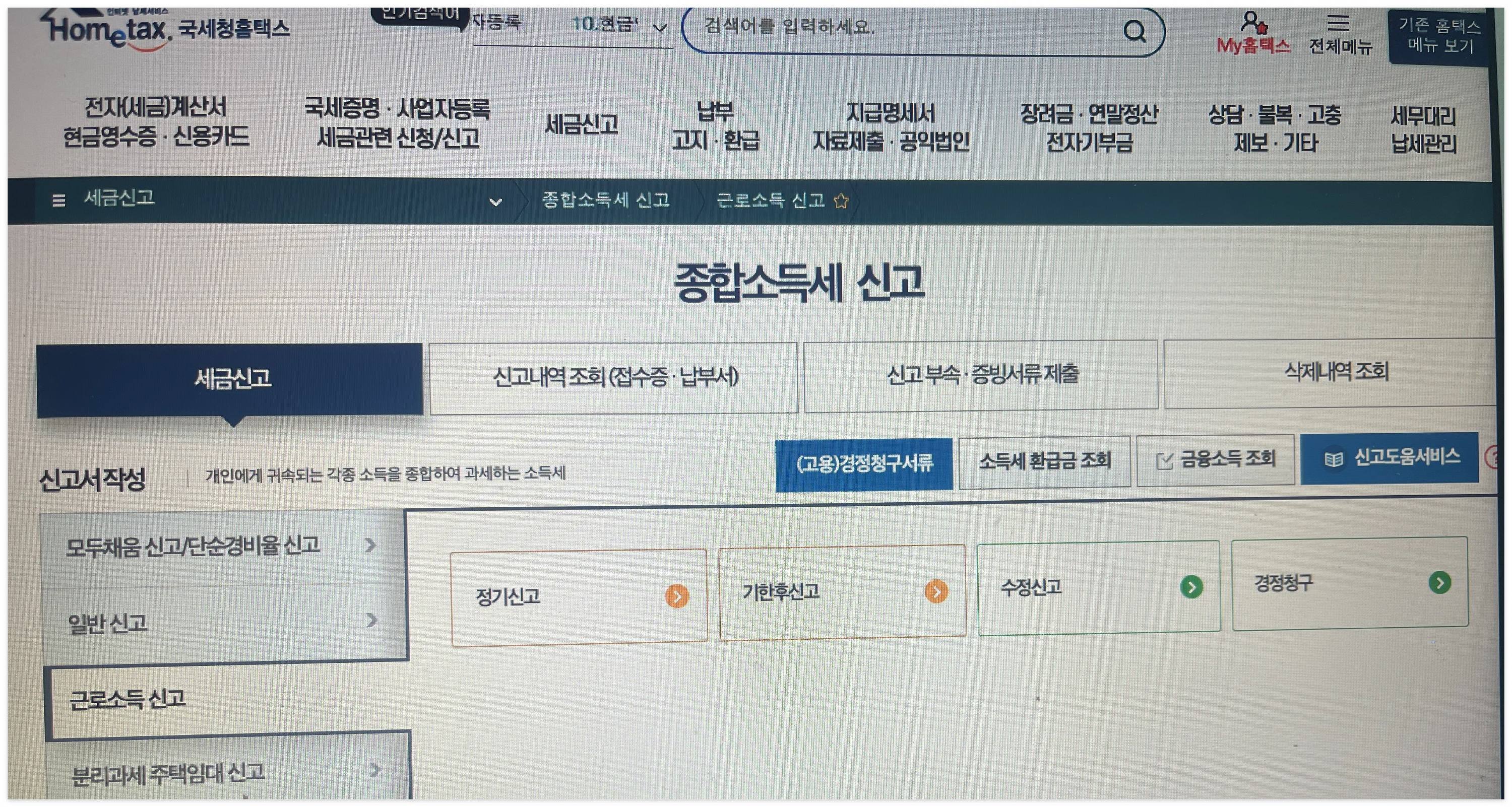 종합소득세 신고 화면으로 들어가 근로소득신고 >>> 그리고 경정청구로 들어갑니다