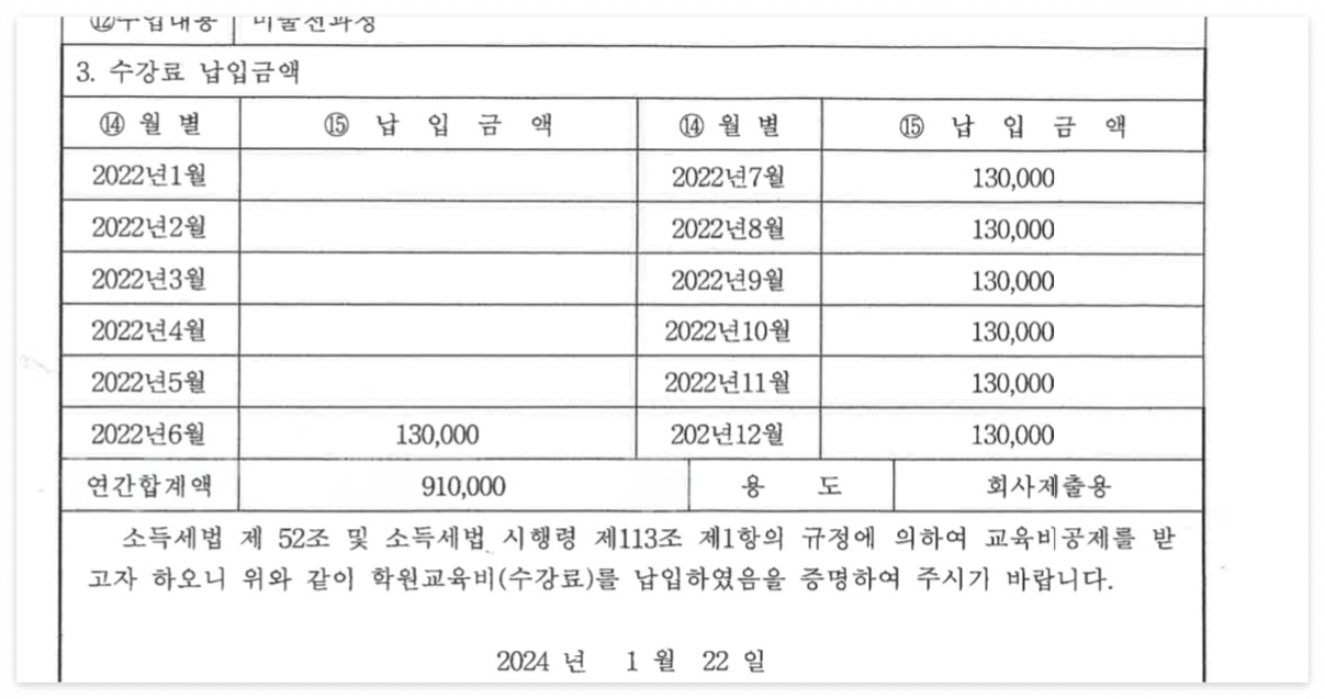 그러다가 올해 초에 작년꺼(23년도분) 학원교육비(수강료) 납입증명서를 학원 원장님께 요청드리면서